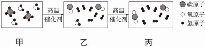 (2) 利用CH₄和H₂O进行催化重整制氢气,反应前后分子变化的微观示意图如图所示。其中“乙→丙”发生反应的化学方程式为________________________。