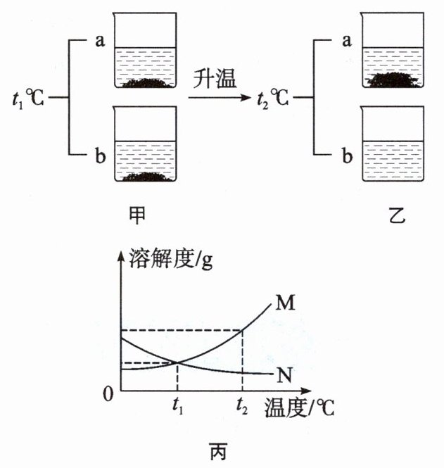 9. $t_1$℃时,将a、b两种固体物质(均不含结晶水)各25g,分别加入盛有100g水的烧杯中,充分搅拌后现象如图甲所示;升温到$t_2$℃时,忽略水分蒸发,现象如图乙所示。图丙是a、b两种固体物质在水中的溶解度曲线。下列说法正确的是( )。