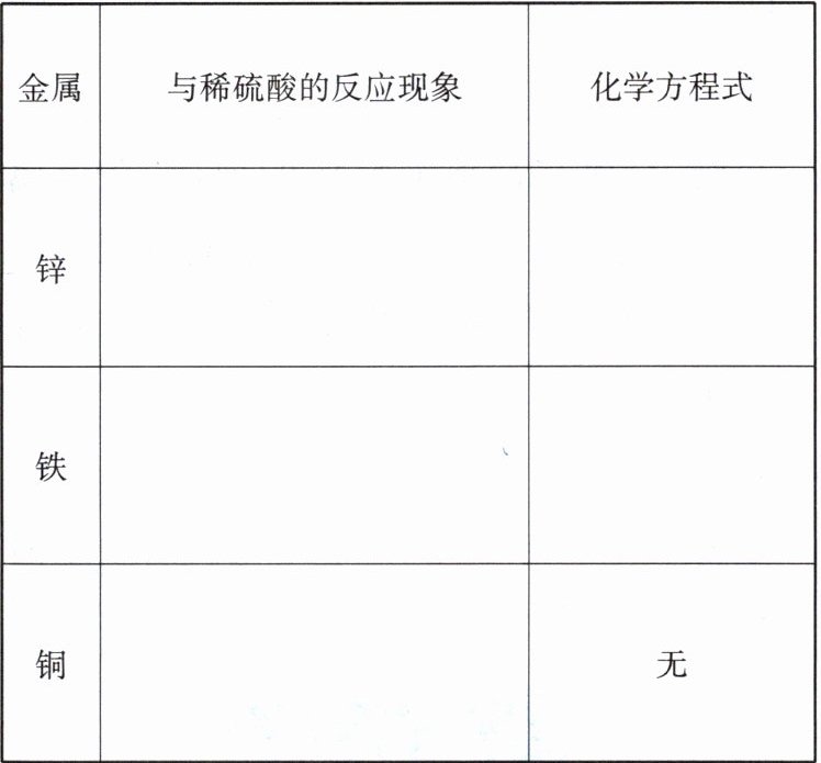 2.锌片表面有无色气泡,得到无色溶液 Zn + H₂SO₄ = ZnSO₄ + H₂↑ 铁片表面有无色气泡,溶液由无色变成浅绿色 Fe + H₂SO₄ = FeSO₄ + H₂↑ 无现象 Mg、Al、Zn、Fe Cu、Hg、Ag 氢前面的金属 稀盐酸、稀硫酸