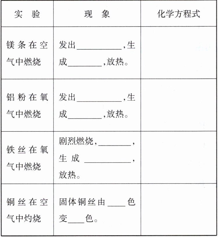 1.耀眼白光 白色固体$ 2Mg + O₂ \stackrel{点燃}{=} 2MgO $耀眼白光 灰白色固体$ 4Al + 3O₂ \stackrel{点燃}{=} 2Al₂O₃ $火星四射 黑色固体$ 3Fe + 2O₂ \stackrel{点燃}{=} Fe₃O₄ $红 黑$ 2Cu + O₂ \stackrel{△}{=} 2CuO $金属本身的性质 氧气的浓度 金属与氧气的接触面积