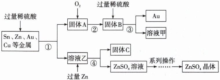 8. 保护金属资源的有效途径之一是金属的回收利用。废旧手机零部件有${Sn}$、${Zn}$、${Cu}$、${Au}$等金属,现要回收${Au}$并制备${ZnSO_{4}}$晶体(${ZnSO_{4}·7H_{2}O}$),其工艺流程如图: