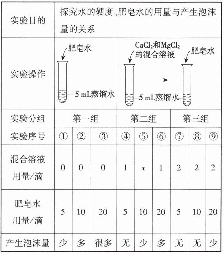 (3) 设计第二组实验时,为控制水的硬度相同,⑤中 $ x $ 应为________。