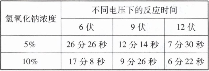 Ⅱ. 实验过程中,同学们发现电解纯水速率较慢。查阅资料获知:调节电源电压或在水中加入少量氢氧化钠溶液都会改变电解速率。于是,他们进行了多次实验,电源电压分别设定为 6 伏(电压的单位“伏特”,简称“伏”)、9 伏、12 伏,氢氧化钠溶液浓度分别为 5%、10%,将实验数据取平均值,记录如下(保持其他条件不变,每次实验收集 10 mL 氧气):
