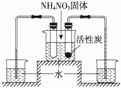 7.用如图所示装置探究“活性炭吸附能力与温度变化的关系”。将硝酸铵($NH_4NO_3$)固体加入水中搅拌,观察到两侧玻璃导管中液面上升的高度不同(如图所示)。