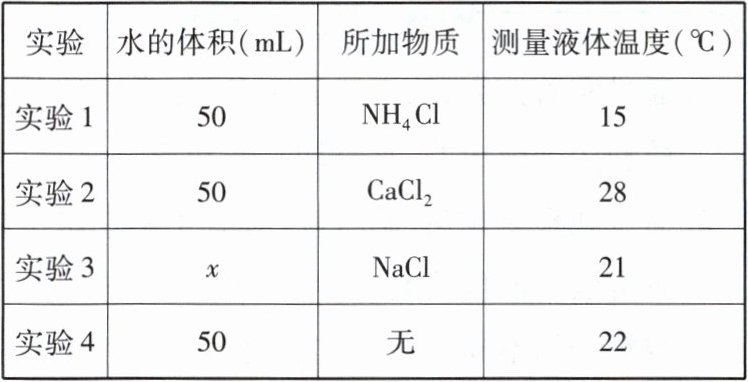 水、$NH_4Cl$、$CaCl_2$、$NaCl$;烧杯、药匙、玻璃棒、量筒、温度计等。