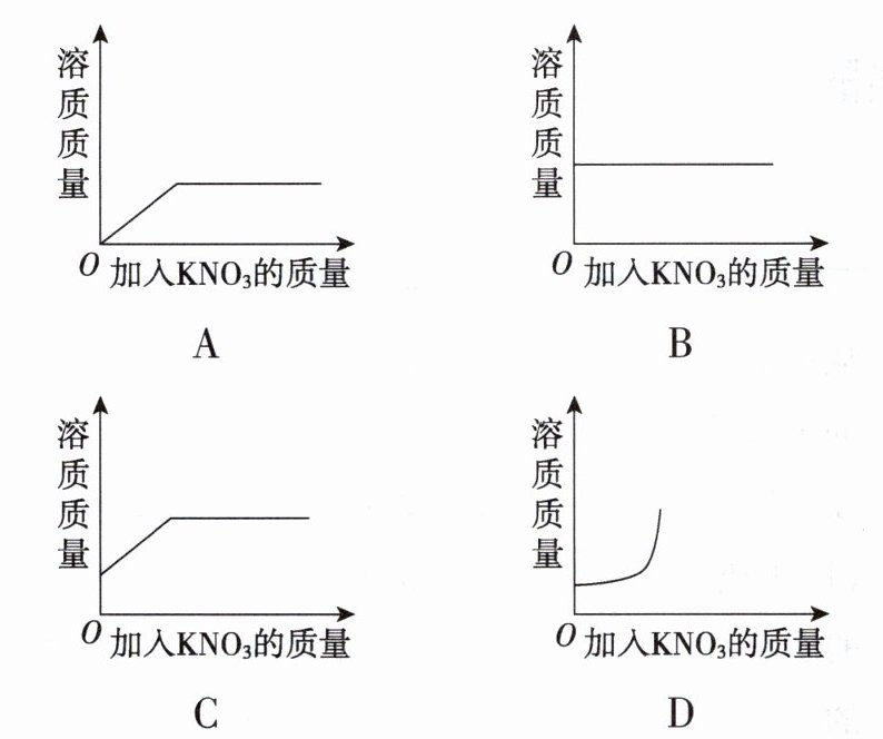 4. 一定温度下,向一定量的水中,逐渐加入硝酸钾固体,下列图像符合溶液中溶质质量变化规律的是( )。