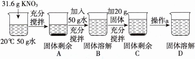 5. $20\ ^{\circ}C$时,向$50\ g$水中加入$31.6\ g\ KNO_3$固体并进行如下系列操作。请回答相关问题: