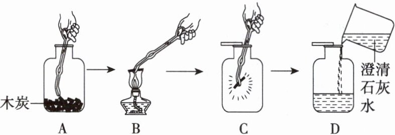 图C中木炭在氧气中燃烧比空气中要剧烈,说明了____;燃烧停止后,往集气瓶里加入少量的澄清石灰水,振荡,发生的现象是____。盛放氧气的瓶口盖上玻璃片的目的是____。