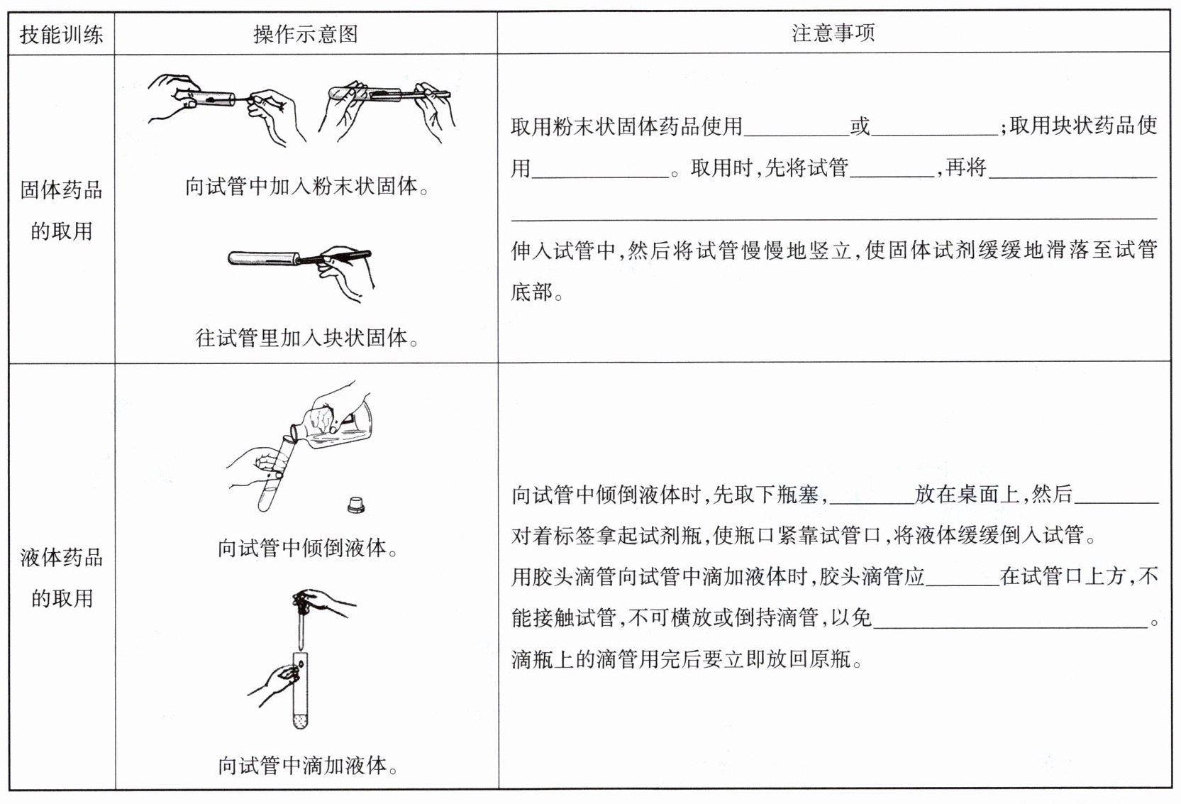 2.药匙 纸槽 镊子 平放 盛有粉末状固体的药匙或夹持块状固体的镊子 倒 手心 垂悬 药品腐蚀胶帽
