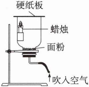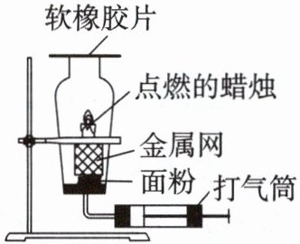 7. 如图所示为模拟粉尘爆炸的实验装置。用打气筒向容器内打气吹散面粉,瞬间发生爆炸,软橡胶片被冲飞,蜡烛熄灭。