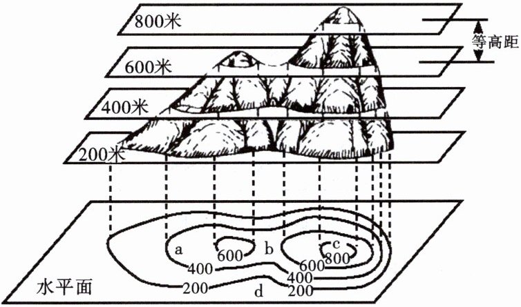 6. 图示 a、b、c、d 4 地中,表示山谷的是(