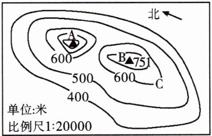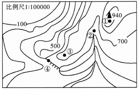)。①等高线密集的地方坡度缓 ②等高线密集的地方坡度陡 ③图中的等高距为 100 米 ④图中最高山峰的海拔范围是 800 ~ 1 000 米