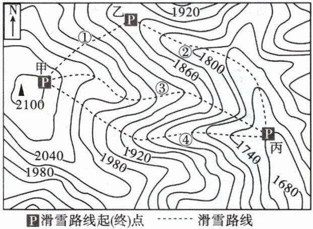 某滑雪场为满足滑雪爱好者的不同需求,依据地形坡度等条件的不同建设了不同难易等级的①②③④4条滑雪路线。读滑雪场等高线示意图,完成第12—13题。