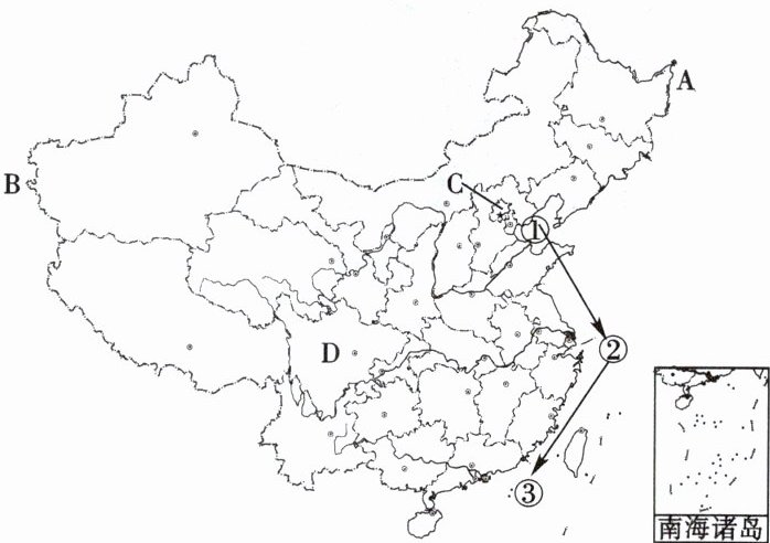 (3)图中D是我国的四川省,位于图中C(北京)的