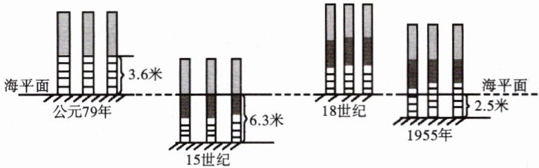 2. 下图是意大利那不勒斯海岸的 3 根石柱升降变化图,石柱上横线部分代表曾被火山灰覆盖的部分,深阴影处代表被海生动物钻孔的部分。这说明(
