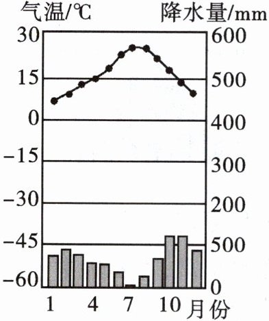 读某地气温曲线和各月降水量柱状图,完成第 1—2 题。