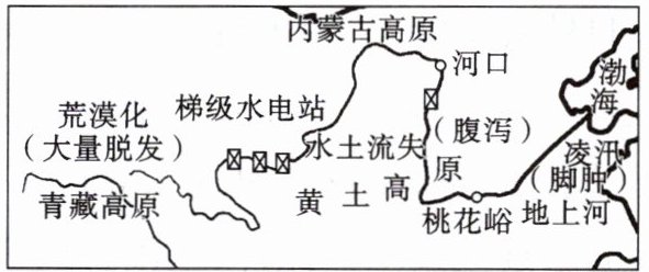 (4)③ ③河段所在的流域为黄土高原,土质疏松,加之人们不合理地垦荒、放牧等,使得该地区植被稀少,夏季降水多以暴雨形式出现,水土流失严重。