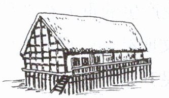 〈材料二〉(他们)已经创造了一种……木构长屋(如下图)。这种住宅十分别致,基础全系桩木构筑……铺设地板,地板以上立柱、架梁、敷椽、盖顶。