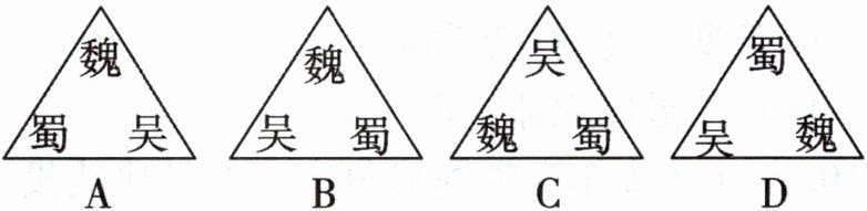 5. 图示法是学习历史的一种好方法,它能将复杂的历史比较直观形象地展示出来。下面的示意图中能直观反映三国鼎立形势的是( )。