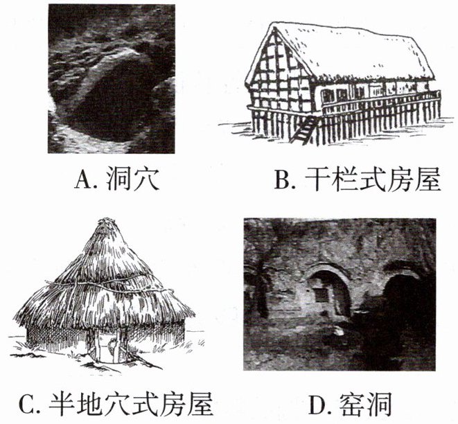 4. 七八千年前的长江流域雨水充沛,气候湿润,虫兽较多,深深影响着农耕时代的农耕文化。下列图片中最贴合此地农耕时代人类定居的是( )。
