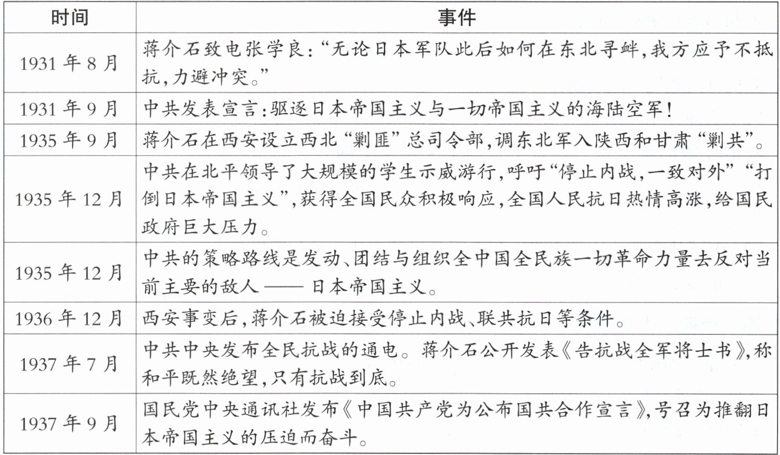 (4)变化:对日本侵略者由“不抵抗”变为抗日御侮。原因:日本加紧侵华,中日民族矛盾已经成为中国社会主要矛盾;国民党和共产党合作建立抗日民族统一战线;民众抗日救亡运动的高涨;中国共产党推动西安事变和平解决。
