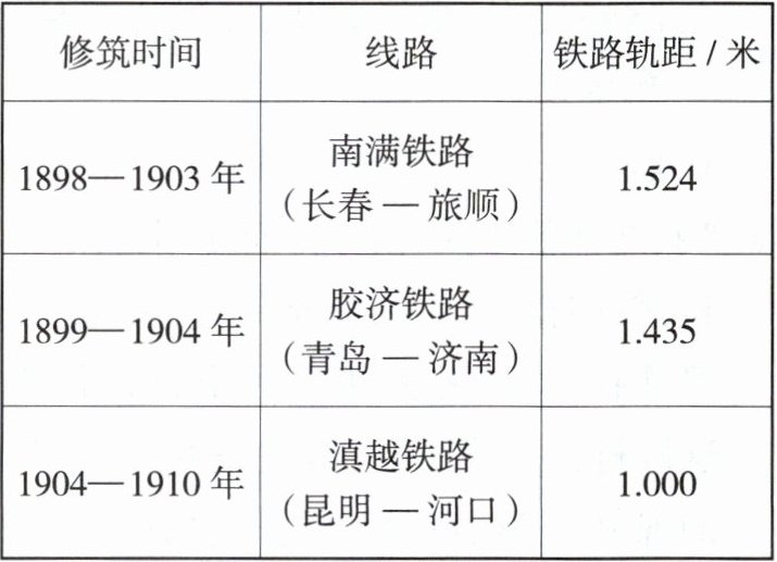 11. 轨距指铁路两股钢轨顶部内侧之间的最短距离,是铁路工程技术标准之一。下表呈现的是晚清时期部分重要铁路的相关信息。造成轨距差异的主要原因是( )。