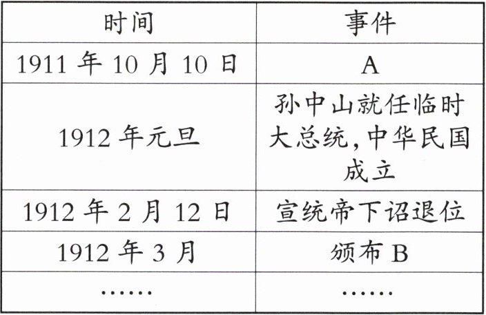 (1)事件:A:武昌起义。B:《中华民国临时约法》。推翻封建帝制(结束了两千多年的封建帝制),推动中国民主政治历程。