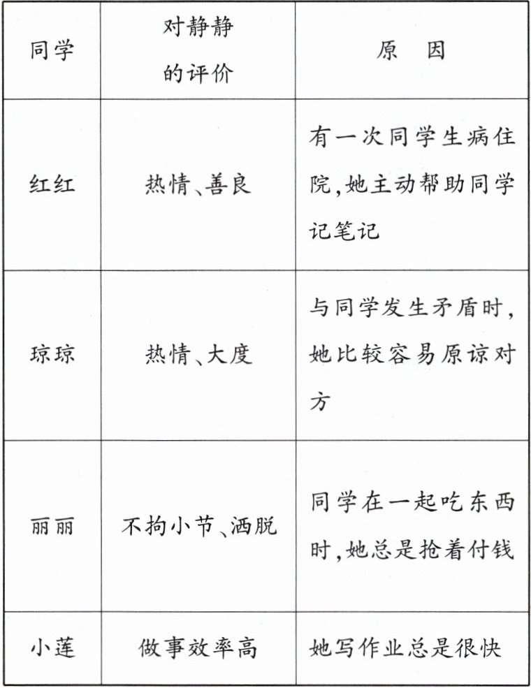 静静为了更好地认识自己,征求了几名同学对自己的评价,调查的结果见下表。
