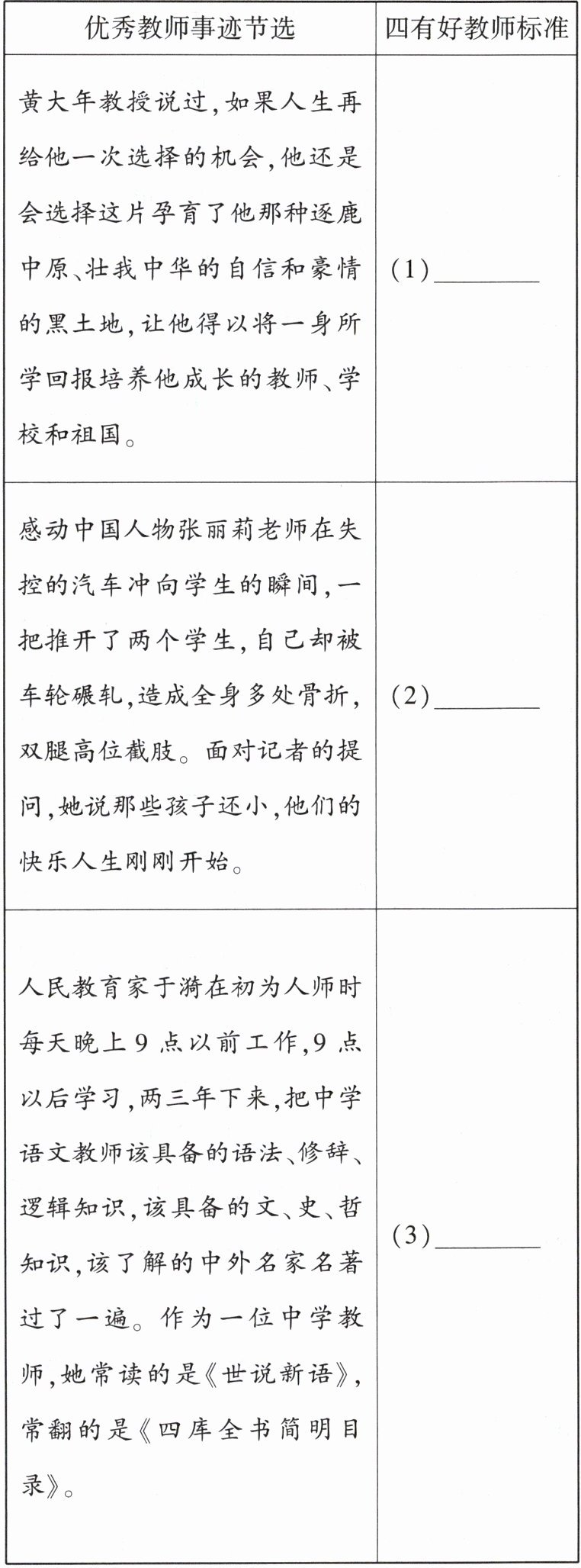 (3)教师作为人类文明的传承者,承载着传播知识、传播思想、传播真理,塑造灵魂、塑造生命、塑造新人的重任。一位好老师应该是有理想信念、有道德情操、有扎实学识、有仁爱之心的老师。