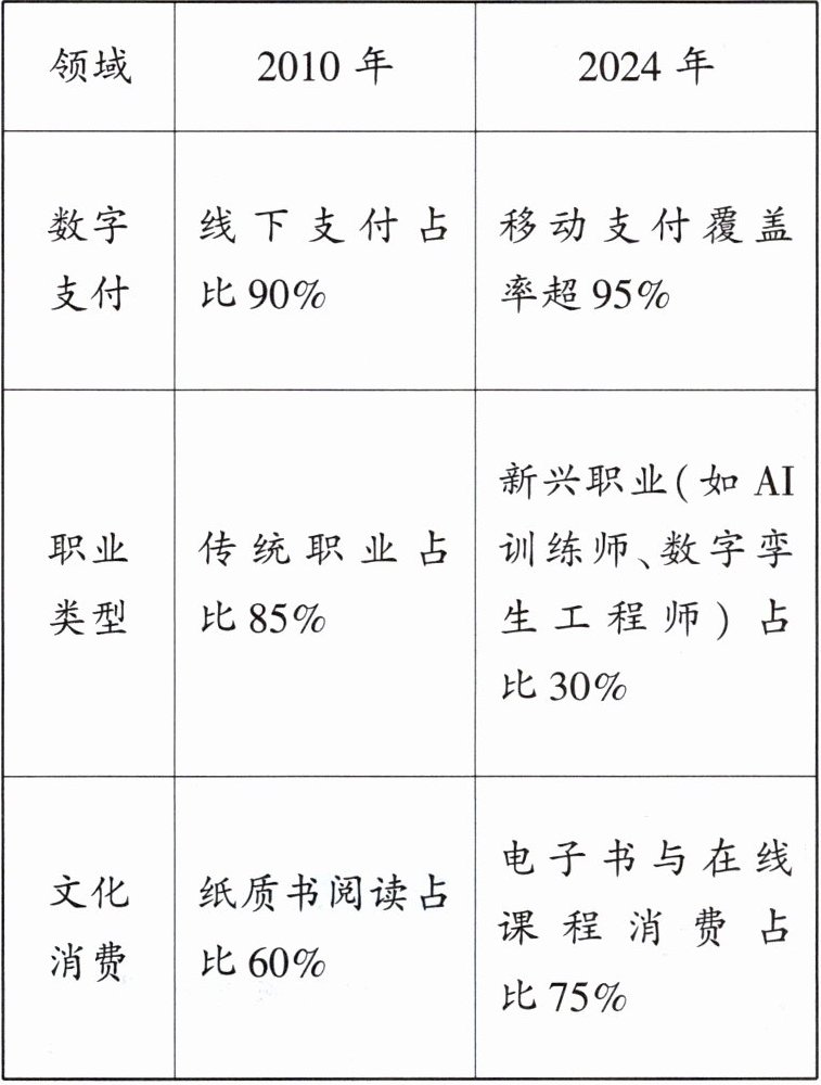 (1)①丰富多彩:从乡村到城市、从传统农业到智能工业,物质产品(如智能设备)和精神活动(如数字文化)丰富多元,职业分工与交往方式(如短视频社交)日益多样。