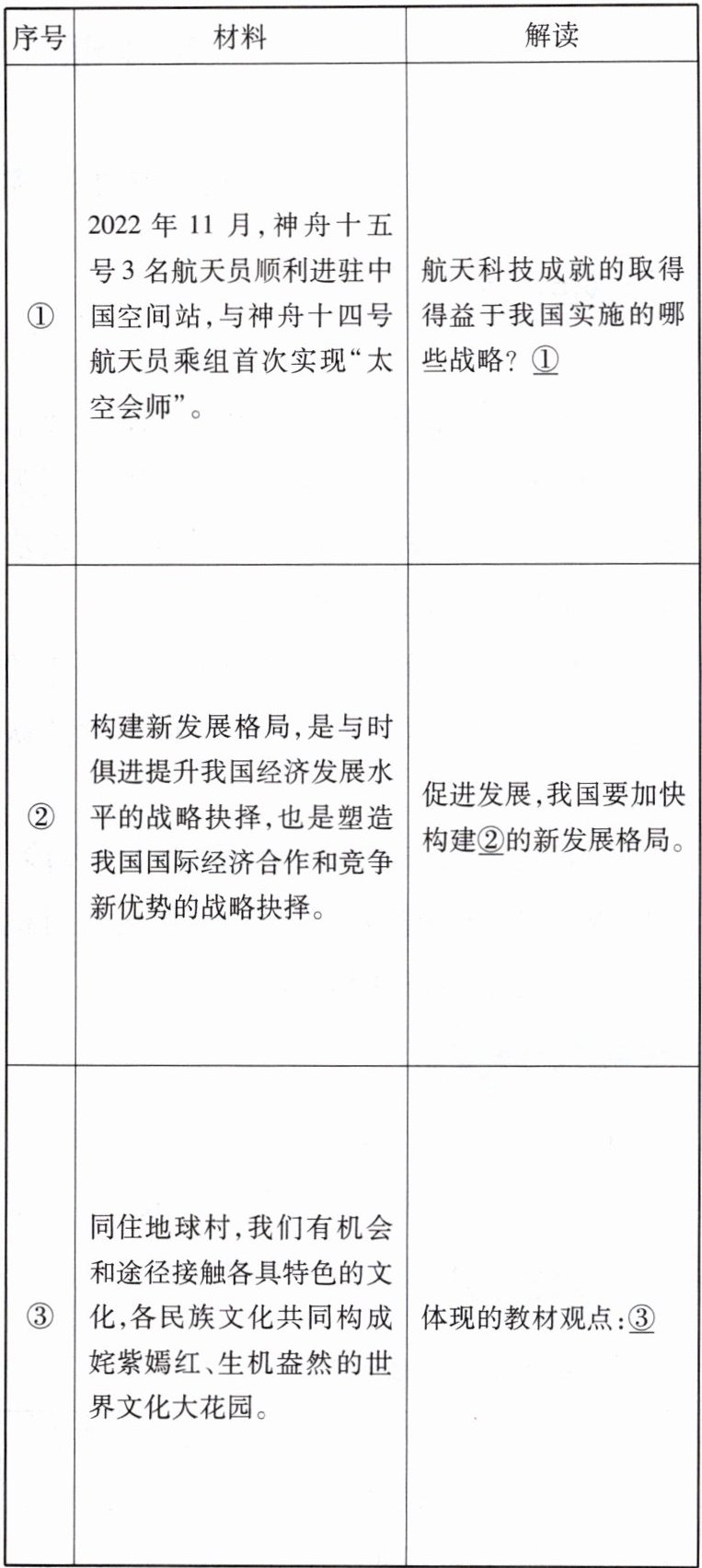 11.①科教兴国战略、人才强国战略、创新驱动发展战略。 ②以国内大循环为主体、国内国际双循环相互促进 ③文化多样性是人类社会的基本特征,是世界文化充满活力的表现,也是人类文明进步的重要动力文化多样性是实现文化创新与发展的前提和基础。正确认识文化差异,相互尊重,通过平等交流、对话,达成彼此包容。用开放和包容的心态,学习和借鉴优秀外来文化,促进和而不同、兼收并蓄的文明交流。
