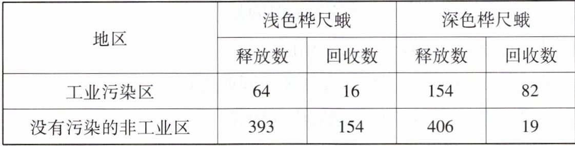 8. 某人做了如下实验:将深色桦尺蛾和浅色桦尺蛾分别进行标记,然后放养于工业污染区和没有污染的非工业区。经过一段时间后,将所释放的桦尺蛾尽量回收,计算其数目,结果如表。