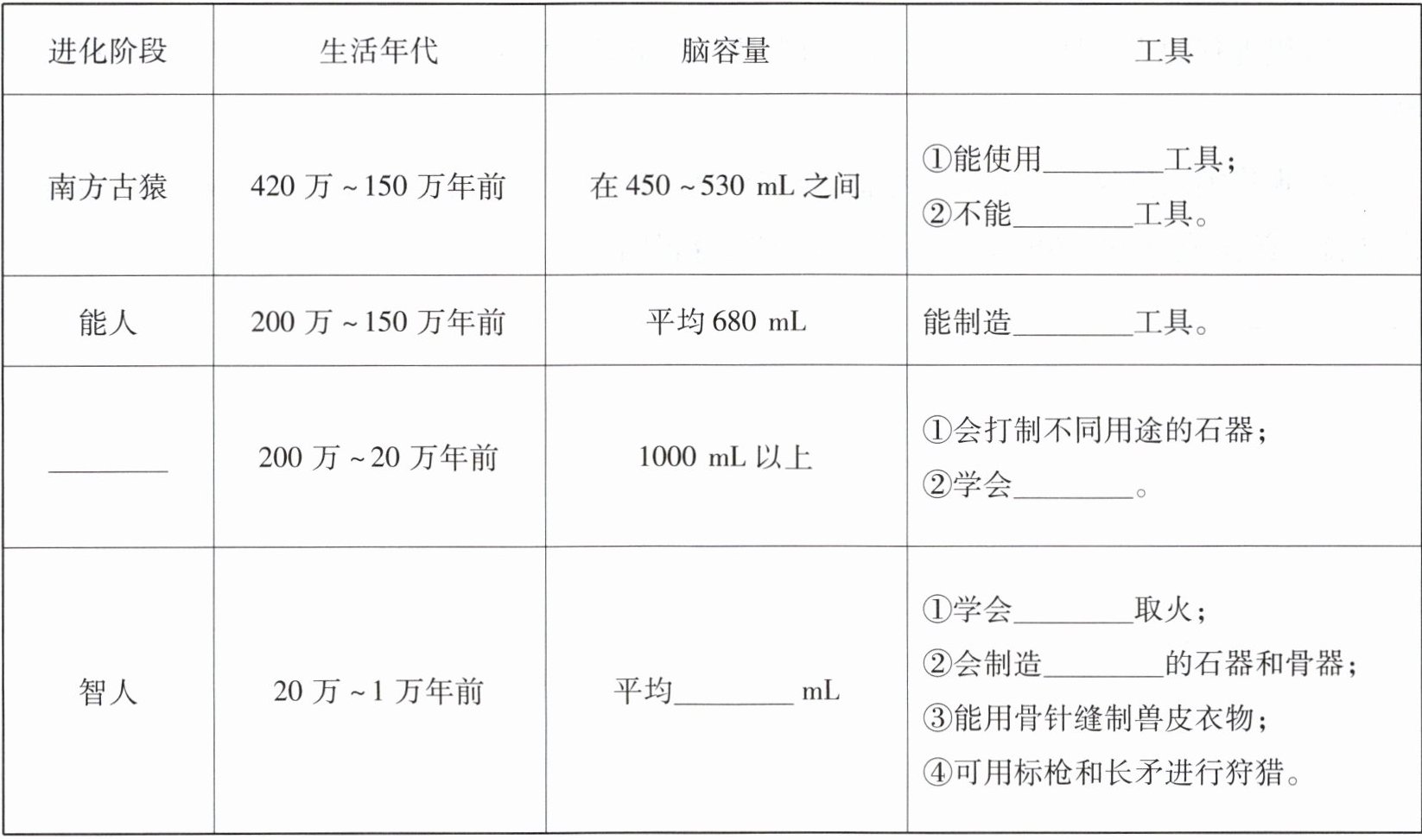 一、1.天然 制造 简单的 直立人 用火 1360 人工 精细 2.劳动