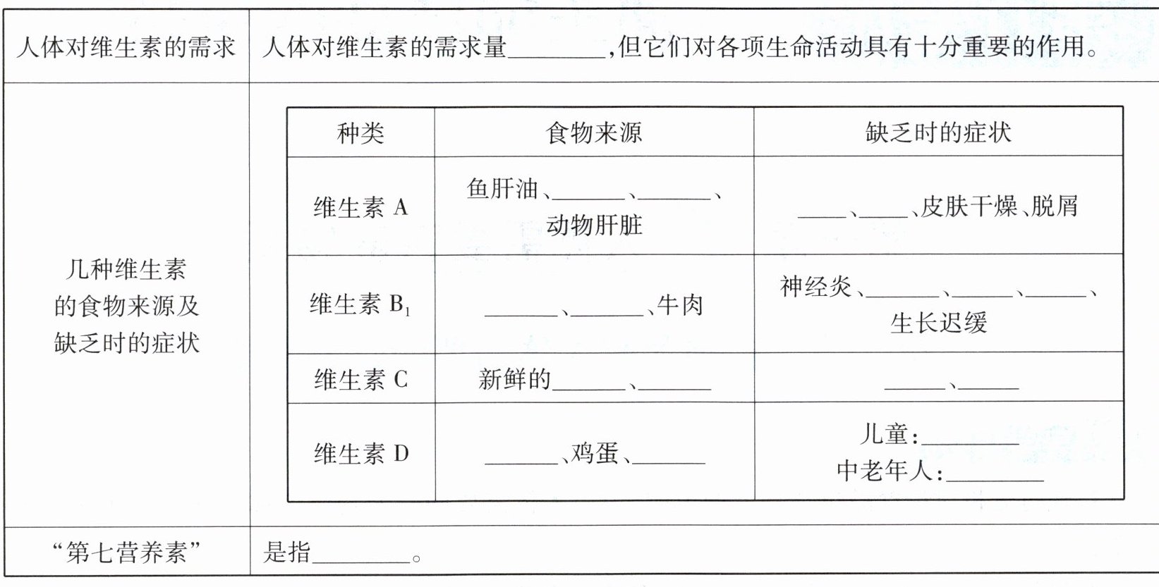 二、很小 胡萝卜 玉米 夜盲症 干眼症 糙米 肾脏脚气病 食欲不振 消化不良 蔬菜 水果 坏血病 抵抗力下降 鱼肝油 肝脏 佝偻病 骨质疏松症 膳食纤维