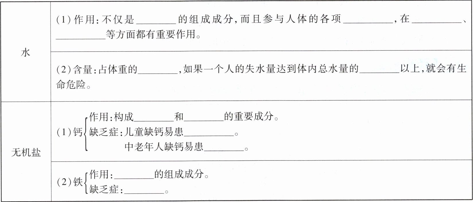 三、细胞 生理活动 物质运输 体温调节 60% ~70% 20% 牙齿 骨骼 佝偻病 骨质疏松症 血红蛋白 贫血症