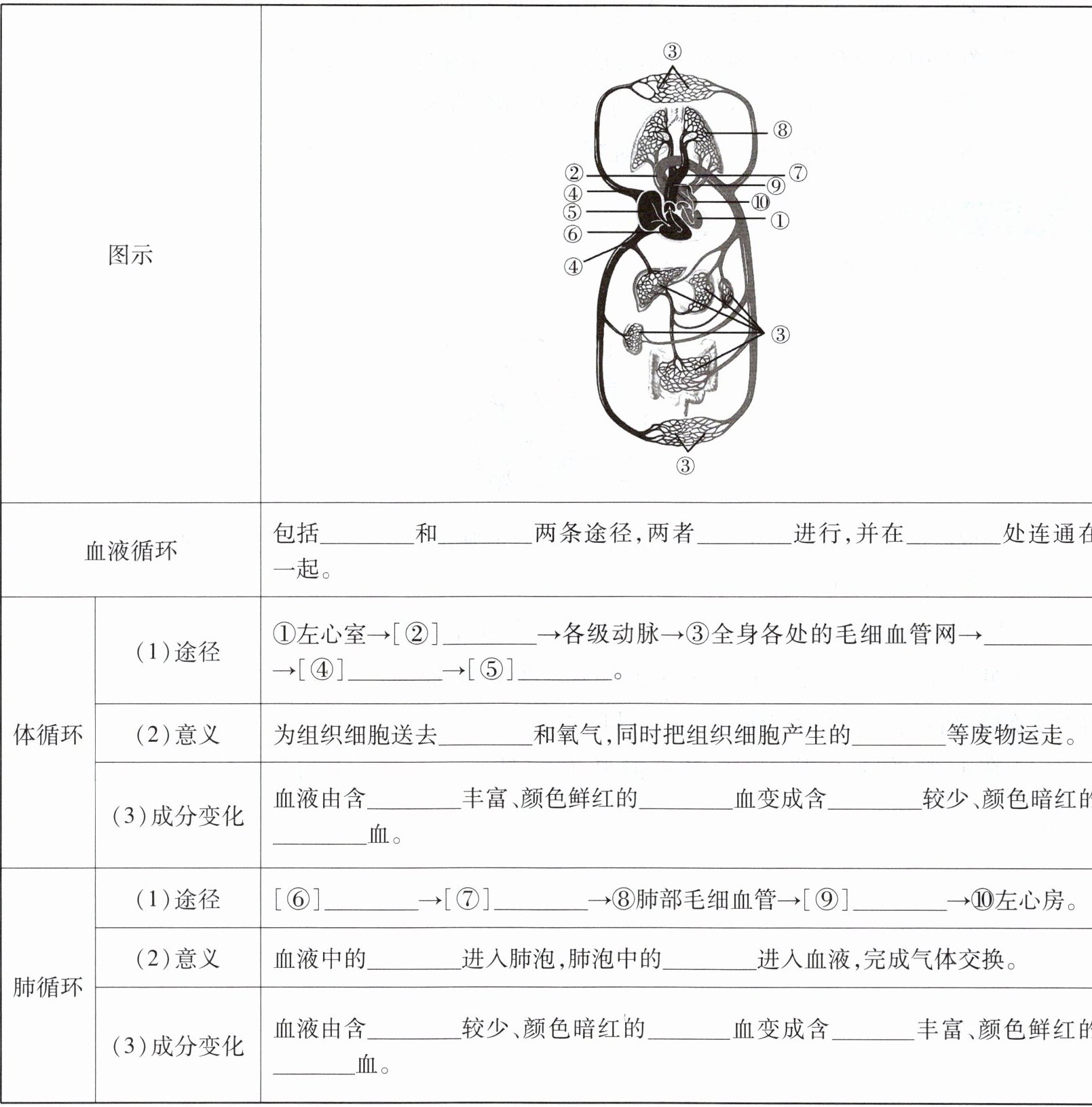 一、体循环 肺循环 同时 心脏 主动脉 各级静脉 上、下腔静脉 右心房 营养物质 二氧化碳 氧气 动脉 氧气 静脉 右心室 肺动脉 肺静脉 二氧化碳 氧气 氧气 静脉 氧气 动脉