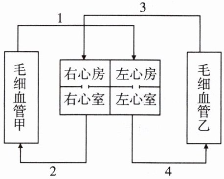 5. 如图是血液循环示意图,1、2、3、4 表示与心脏直接相连的血管,甲、乙表示不同部位的毛细血管。下列说法正确的是(