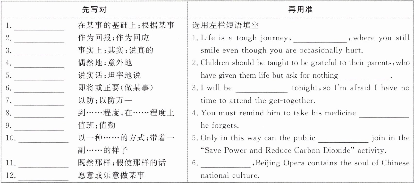 1.on the basis of 2.in return 3.as a matter of fact 4.by accident 5.to be honest 6.be about to do sth 7.in case 8.to... extent 9.on duty 10.in a... manner 11.in that case 12.be willing to do sth 选用左栏短语填空 1.to some extent 2.in return 3.on duty 4.in case 5.be willing to 6.As a matter of fact