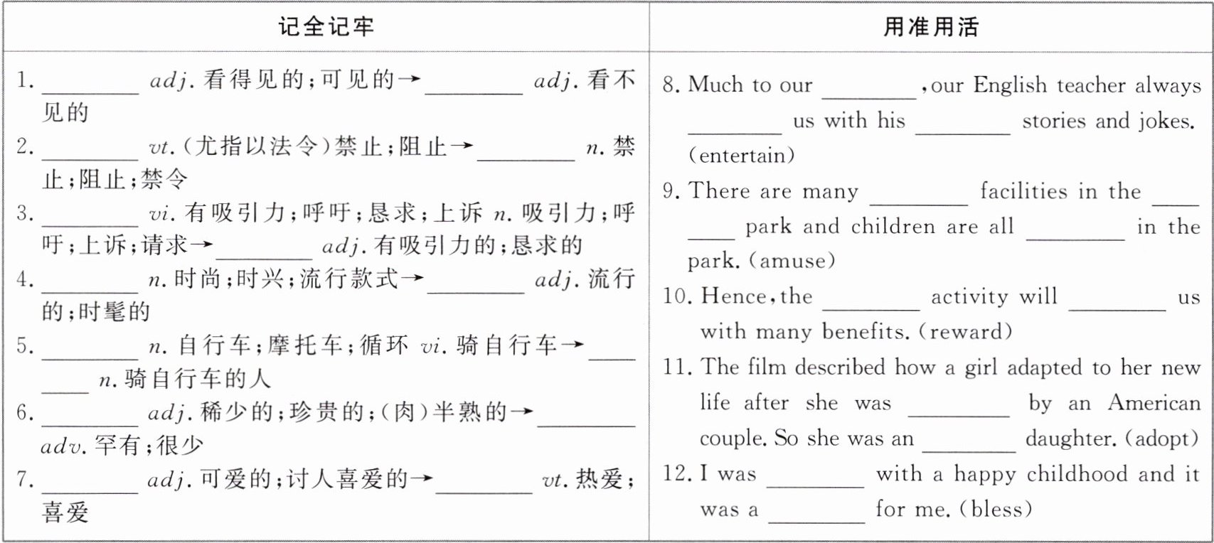 1.visible;invisible 2.prohibit;prohibition 3.appeal;appealing 4.fashion;fashionable 5.cycle;cyclist 6.rare;rarely 7.adorable;adore 8.entertainment;entertains;entertaining 9.amusing;amusement;amused 10.rewarding;reward 11.adopted;adopted 12.blessed;blessing