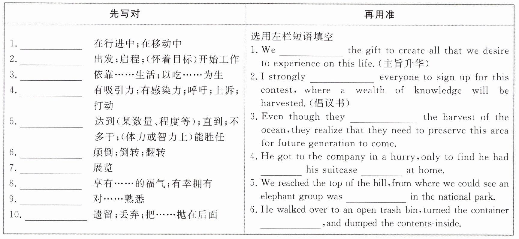1.on the move 2.set out 3.live off 4.appeal to 5.up to 6.upside down 7.on display 8.be blessed with 9.be familiar with 10.leave behind 选用左栏短语填空 1.are blessed with 2.appeal to 3.live off 4.left;behind 5.on the move 6.upside down