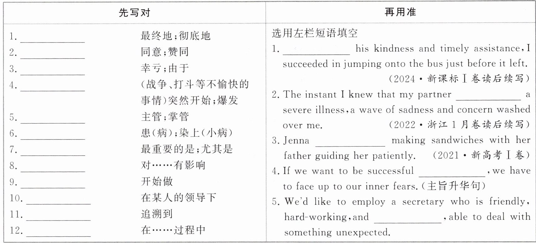 1.once and for all 2.subscribe to 3.thanks to 4.break out 5.in charge of 6.come down with 7.above all 8.have an impact on 9.get down to doing 10.under one’s leadership 11.be traced back to 12.over the course of 选用左栏短语填空 1.Thanks to 2.came down with 3.got down to 4.once and for all 5.above all