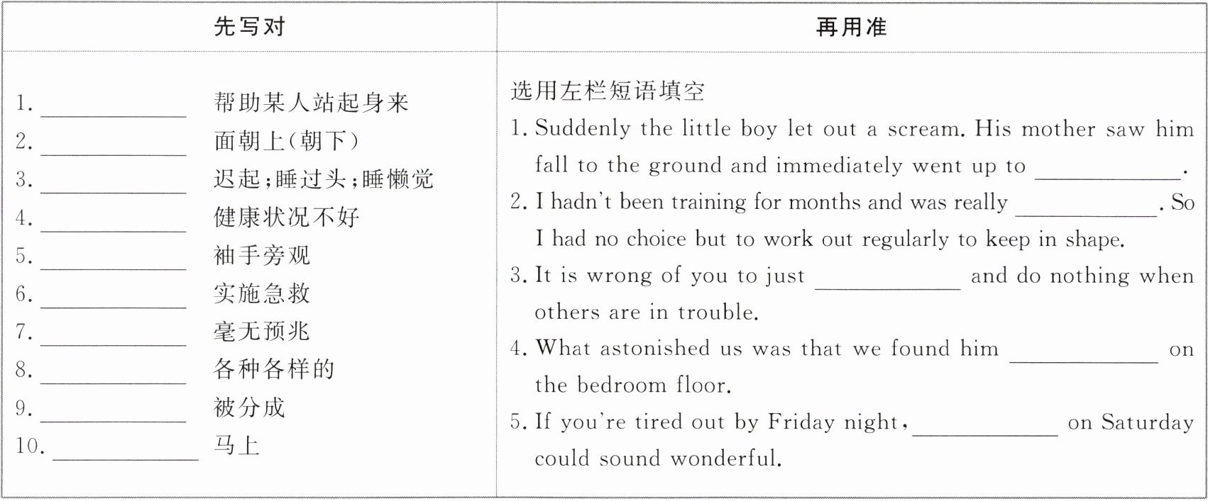 1.help sb to one’s feet 2.face up/down 3.sleep in 4.out of shape 5.stand by 6.give first aid 7.without warning 8.a variety of 9.be divided into 10.without delay