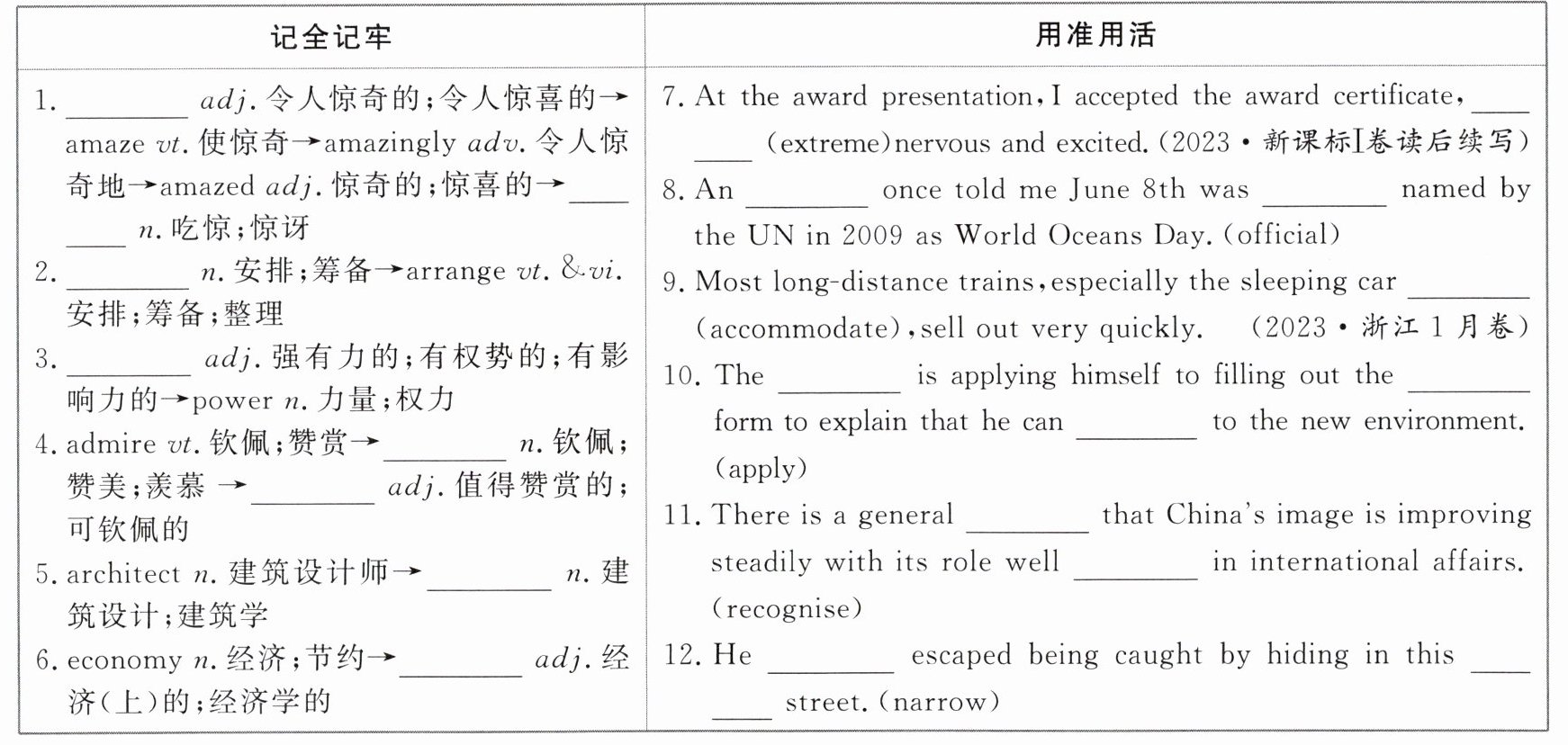1.amazing;amazement 2.arrangement 3.powerful 4.admiration;admirable 5.architecture 6.economic 7.extremely 8.official;officially 9.accommodations 10.applicant;application;apply 11.recognition;recognised 12.narrowly;narrow