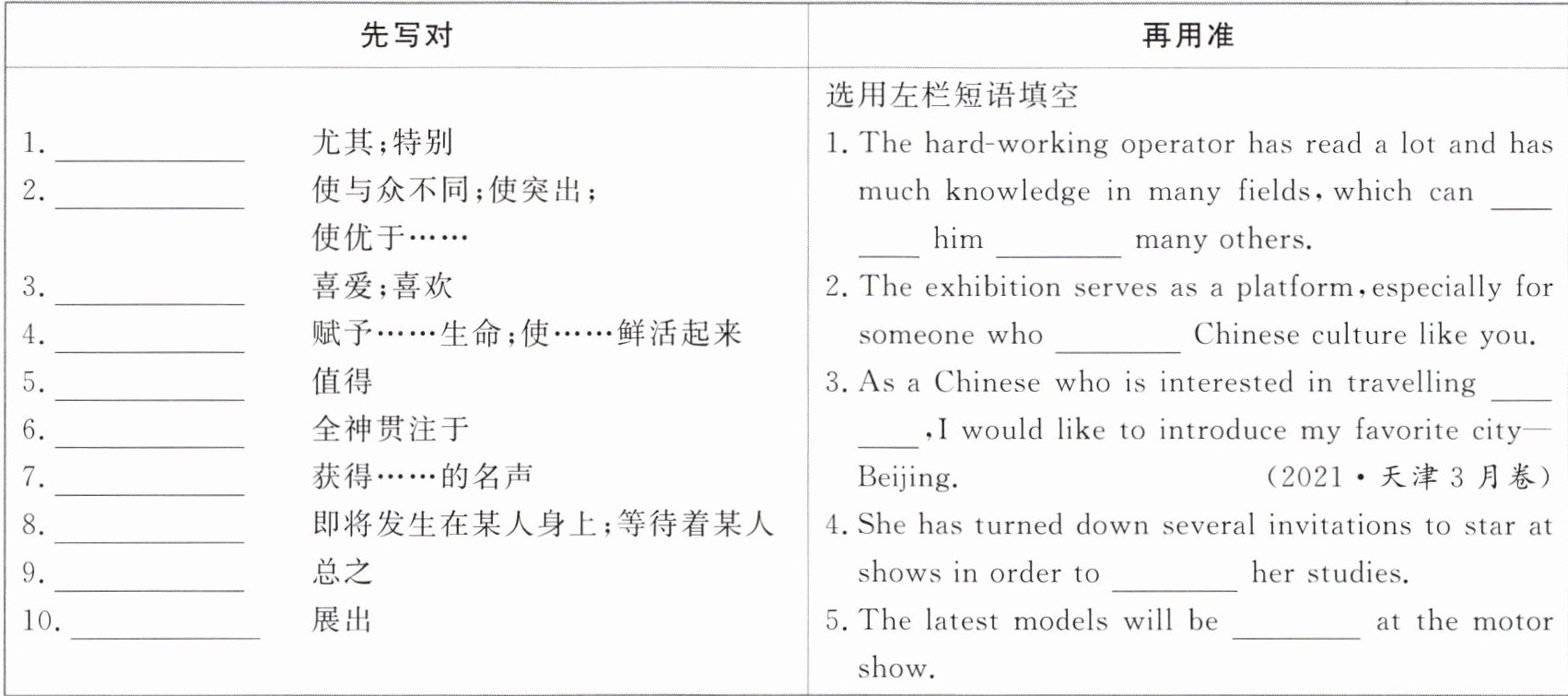 1.in particular 2.set apart from 3.be fond of 4.bring... to life 5.be worthy of 6.concentrate on 7.gain a reputation as 8.in store for sb 9.in short/to sum up 10.on display
