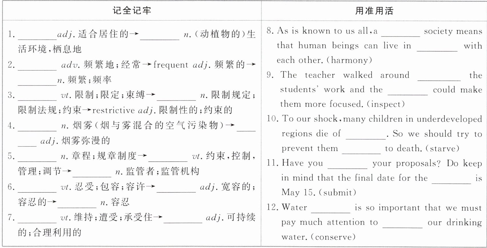 tolerant;tolerance 7.sustain;sustainable 8.harmonious;harmony