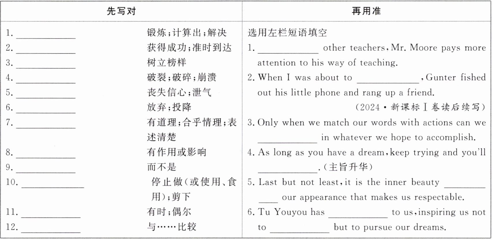 重点短语——学其用 1.work out 2.make it 3.set an example 4.fall apart 5.lose heart 6.give up 7.make sense 8.make a difference 9.rather than 10.cut…out 11.now and then 12.compare…with/to… 选用左栏短语填空 1.Compared with/to 2.give up 3.make a difference 4.make it 5.rather than 6.set an example;lose heart