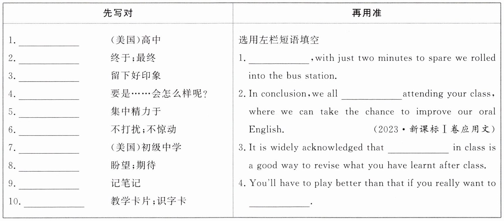 1.senior high school 2.at last 3.make an impression 4.what if 5.concentrate on 6.leave...alone 7.junior high school 8.look forward to 9.take notes 10.flash card 选用左栏短语填空:1.At last 2.look forward to 3.taking notes 4.make an impression