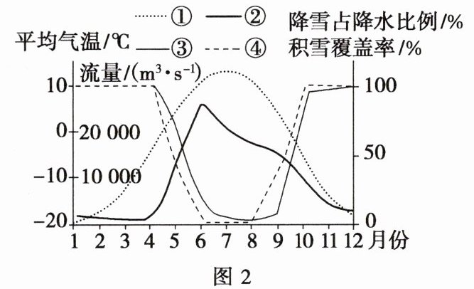 1.D 2.C 3.B 第1题,育空河位于北半球,1月份气温最低,7月份气温最高,判断①为平均气温;该流域纬度较高,冬季和初春以地下水补给为主,河流流量较小,春末夏初气温升高,积雪融水增多,河流进入汛期,判断②为流量;随着春季气温回升,降雪占降水比例下降,积雪覆盖率随之下降,随着秋季气温下降,降雪占降水比例上升,积雪覆盖率随之上升,据此可判定③为积雪覆盖率,④是降雪占降水比例。故选D。第2题,育空河流域位于北极圈附近,气温低、降雨少、冻土发育,雨水和地下水补给较少,A、B错误;结合图2可知,4月河流流量开始大量增加,推测河流的主要补给来源为积雪融水,C正确;流量开始减小早于气温达到最高,说明冰川融水不是主要补给来源,D错误。第3题,在降水总量变化不明显的情况下,由于气候变暖,气温升高,育空河流域积雪冰川消融量和多年冻土的消融量增加,会使育空河径流总量增加,③④正确;全球变暖,气温升高,蒸发加强,②错误;全球变暖,冻土消融,径流下渗增多,①错误。故选B。