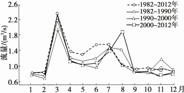 1.B 2.A 第1题,据图可知,该河流径流量最大的月份在3月,结合该河流发源于天山北坡海拔3400m的山区,当地因海拔高、纬度较高,冬季有降雪累积,春季时气温回升,积雪融化补给河流径流量大;径流量的第二高峰出现在夏季,夏季对流运动较为旺盛,在山地附近形成局部暴雨,短时间内补给河流水量较大,形成短期洪峰,B正确;西北地区依靠冰川融水的最大汛期应在夏季,C、D错误;地下水补给河流相对平稳,不会出现明显的季节变化,A错误。第2题,据上题分析得知,8月河流径流量主要由雨水补给,依靠的是短时间强对流的暴雨,全球气候变暖导致局部气候不稳定,降水变率变大,出现个别年份局部地区降水异常增加,A正确;季节性冻土消融对夏季河流径流量影响小,B错误;题目没有信息说明植被覆盖率变化和人类活动影响,排除C、D。