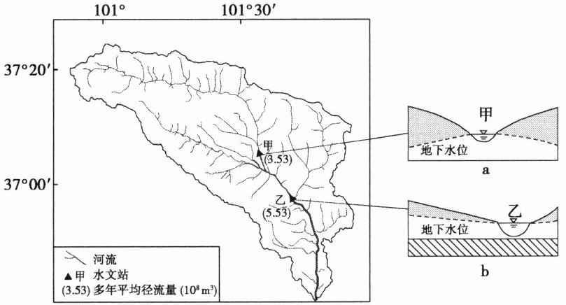 (1)在图b中用箭头表示乙水文站河水与地下水的补